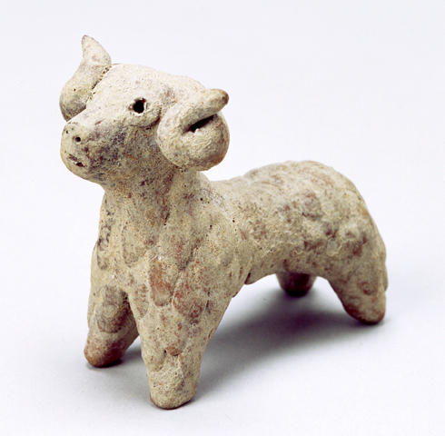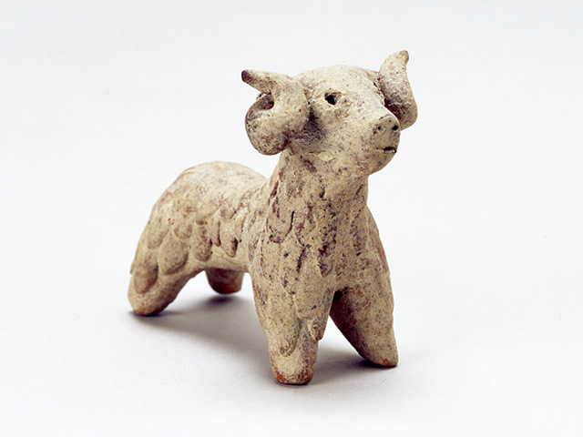 土製品 Clay シリア Syria 中期青銅器時代 紀元前第2千年紀前半 Middle Bronze Age, 2nd millennium BCE 高6.8 cm, 長7.5 cm H. 6.8 cm, L. 7.5 cm 円い目、丸まった角、ふさふさした毛が立体的に表されています。粘土で作られた小動物像は新石器時代から知られていますが、この羊像は、立体的な毛の表現から青銅器時代のものではないかと思われます。 Modeled in clay, this sheep has cute round eyes, curled horns, and a thick coat of hair. Clay animals were made as early as the Neolithic period. From the detailed modeling of the surface, this sheep may date from the Bronze Age. |