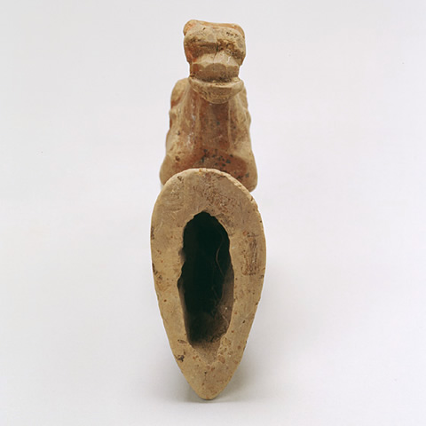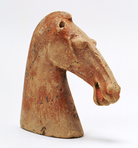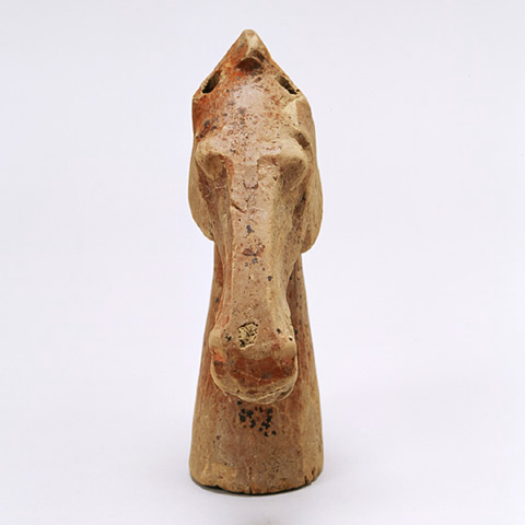 土製品 Clay 中国 China 後漢 1~2世紀 Eastern Han Dynasty, 1st-2nd century CE 高16.9 cm H. 16.9 cm 俑とは、死者とともに葬られるために作られた、粘土製の人や動物の模型です。この馬は、今では頭部しか残っていませんが、もともとは全身像だったと思われます。馬の特徴を捉えた生き生きとした造形で、赤色で彩られています。金属製のミニチュアの馬具を伴って出土する例もあります。 Yong, or terracotta figures buried in the tomb, were made to function as the real object they represent in the service of the deceased. This head of a horse is characterized by remarkably idealized modeling. Some yong horses have been discovered together with metal harnesses. |