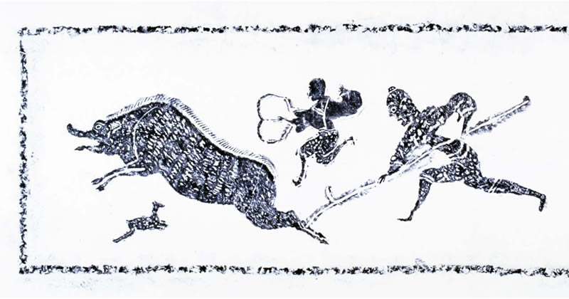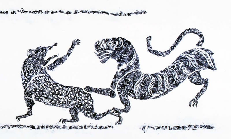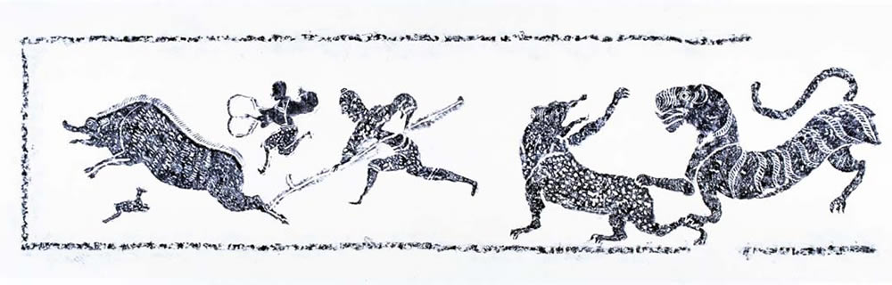 画像石拓本 Rubbing from Stone Relief 中国河南 Henan, China 後漢 1~3世紀 Eastern Han dynasty, 1st-3rd century CE 高48.5 cm, 幅178.1 cm H. 48.5 cm, W. 178.1 cm この画像は、約2千年前の中国、後漢時代に刻まれた石の浮彫から採られた拓本です。画面左側は猪を追う狩猟の場面、右側には熊と虎の戦いが表されています。漢代美術の特徴である生き生きとした動物の描写とともに、その時代の習慣や武器の種類まで伝え残す貴重な画像です。『春秋左氏伝』によると、古代中国で狩猟は単に獲物を捕らえる活動ではなく、四季の農閑期に行う武事の訓練であり、また、先祖の霊に捧げるいけにえを用意する祭祀の行事としても重要な意味を持っていました。 Much of our knowledge on Han life and art is derived from subterranean tomb chambers where stone slabs with engraved designs embellished the walls and ceilings. The present rubbing was taken from such a stone slab. The left half shows two men chasing a huge boar with a crossbow. In ancient China, hunting was an important part of military training, and the game was customarily presented to the offering shrine to please the ancestral spirit. The tiger and the bear were both regarded as sacred animals. The talented Han artists vividly represented the animals with a movement unique to each species. |