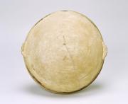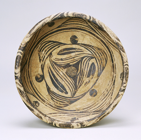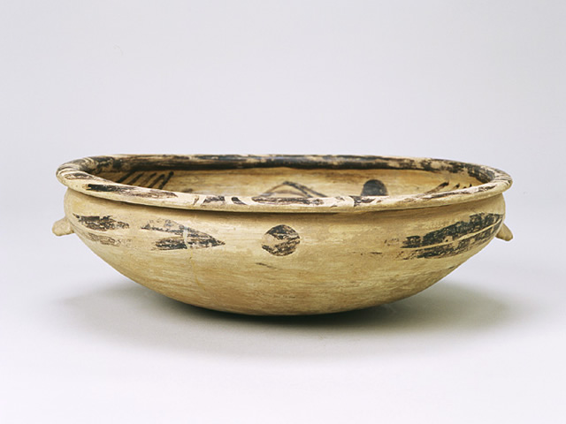 彩陶 Painted pottery 中国青海・甘粛 Qinghai or Gansu, China 馬家窯文化 紀元前3000年頃 Neolithic period, Majiayao culture, ca. 3000 BCE 径33.0 cm, 高10.2 cm D. 33.0 cm, H. 10.2 cm 中国新石器時代の仰韶文化や馬家窯文化では特徴的な文様が描かれた土器(彩陶)が発達しました。黒色で美しい幾何学文様が施されたこの鉢は、馬家窯文化期のものと思われます。内面、縁の付いた口縁部、外面上部に文様が施され、両側に二つの把手が付いています。 High level of pottery culture developed in China during the Neolithic period, as exemplified by painted pottery of Yangshao culture and Majiayao culture. This vessel with dynamic geometric design in black on the inside, outside and along the rim pertains to the Majiayao culture. |