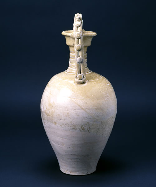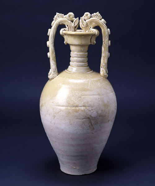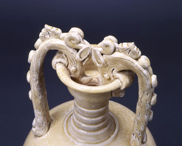 陶器 Glazed pottery 中国 China 初唐 7~8世紀 Early Tang dynasty 7th-8th century CE. 高 48.6 cm H. 48.6 cm 卵形の胴に長い頸、左右に長い把手(耳)を持つ形は、古代ギリシアのアンフォラという壺を思わせ、西方から伝えられた形状と考えられています。西方的な器形がそのまま模倣されるのではなく、中国で伝統的に好まれていた龍のデザインが組み合わされています。ユーラシア大陸の幅広い交流がうかがわれると同時に、美しいフォルムに唐代の美意識も感じられます。 This oval-shaped vase with two handles is reminiscent of ancient Greek amphorae. While the silhouette is of the Western origin, the dragon-shaped handles are of the Eastern inspiration, which bespeaks cultural exchange across the EurAsian continent. Beautiful vases like this, reflecting Tang aesthetic, were specially made for ritual purposes. |