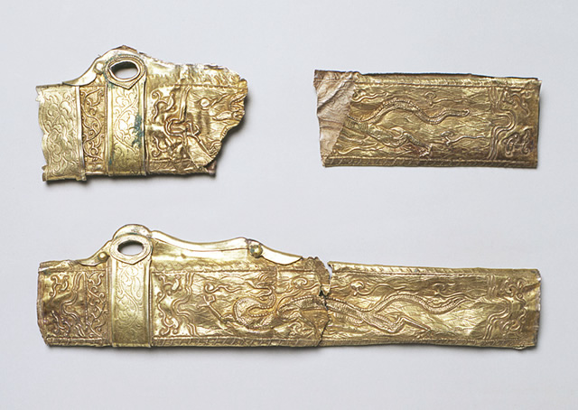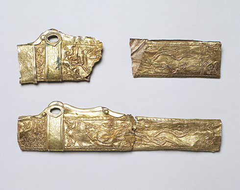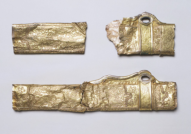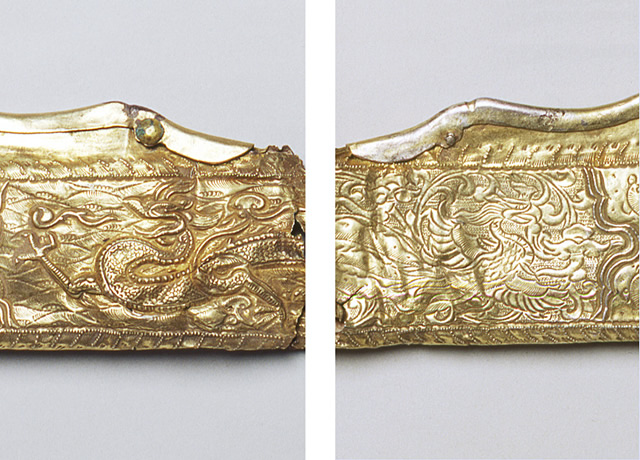 鍍金銀製 Gilded Silver 中国 China 遼 10~11世紀 Liao dynasty, 10th-11th century CE 最大片長30.1 cm, 幅7.3 cm Max. L. 30.1 cm, W. 7.3 cm 遼代の墓からは、鍍金された銀製品の出土が知られています。この鍍金銀製の鞘は、片面には龍が、もう片面には鳳凰が打ち出され、雲文、唐草文などが施されています。下は鞘口の飾りが失われており、鞘口の飾り金具の下にも文様が打ち出されていることが判ります。2点ともほぼ同形であったと思われます。 From Liao-dynasty tombs, gilded-silver objects have been excavated. These fragments of a gilded-silver sheath of a dagger can be reconstructed into two pieces, both of which bear a hammered out dragon motif on one side, and a phoenix on the other side. |