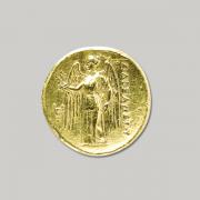| 金 Gold ギリシア、アテネ Athens, Greece 在位紀元前336~323年 r.336-323 BCE 径18.8 mm, 8.5 g D. 18.8 mm, Weight 8.5 g コインは公的発行者によって一定の重量と質を保証された金属片です。王や守護神の像、発行者の権力や発行都市を象徴する動物などが細かに表わされており、当時の造形芸術の成果が小さな中に凝縮されています。 The intricate relief designs that were struck on coins, which enable us to enjoy them now as “miniature sculptures,” certified that governmental authority had issued them with the appropriate value and quality. Images of kings, deities, animals, and plants figure on coins to symbolize the power of the issuing authority or to signify the place of issue.  |
