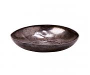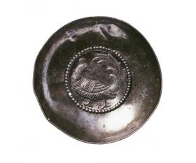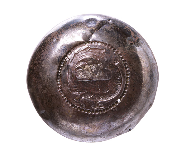 銀または佐波里 Silver(?) イラン、デーラマン Dailaman, Iran ササン朝 Sassanid period 径 13.0 cm, 高 2.5 cm D. 13.0 cm, H. 2.5 cm 底部中央に鳳凰か孔雀が表わされ、連珠文が取り巻いています。文様は、裏面から鎚で打ち出して作られています。 A phoenix, or peacock, appears inside a pearl roundel. The technique of repousse was used to hammer out the design from the reverse side. Since ancient times, the legendary bird phoenix has been treasured as a good sign. |