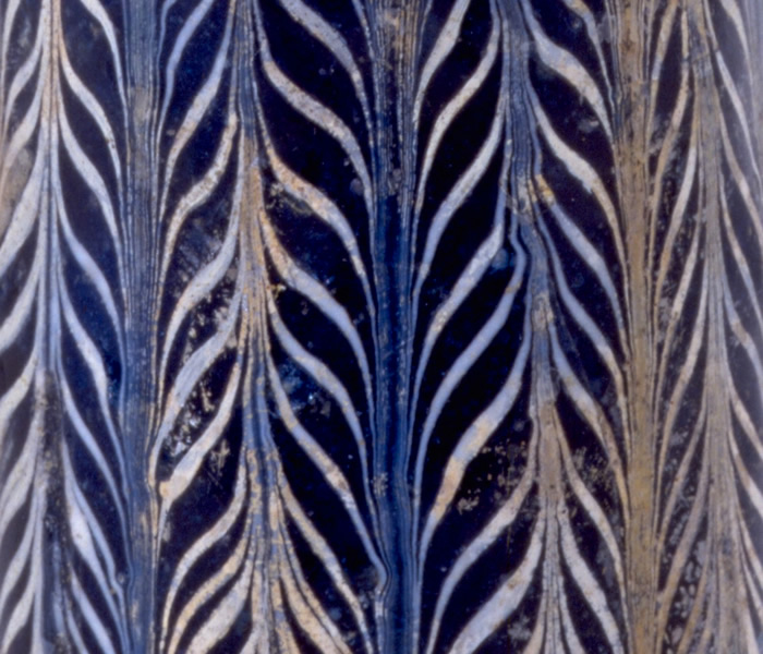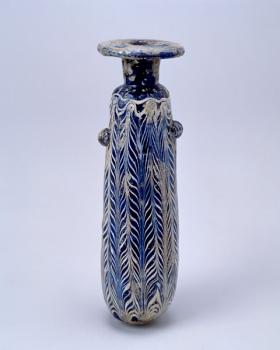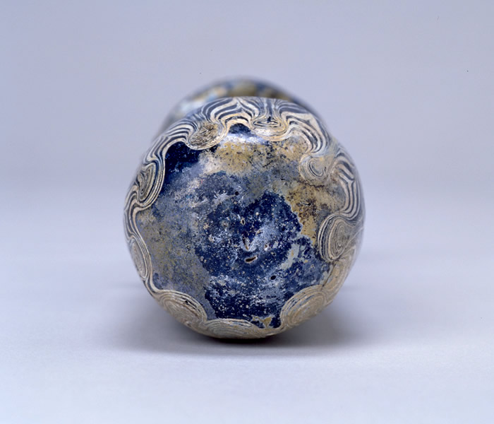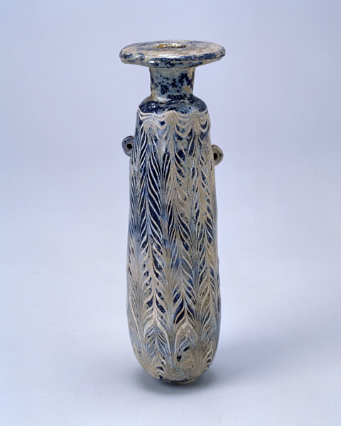 ガラス Glass シリア Syria 紀元前5~3世紀 5th-3rd century B.C.E. 高20.0 cm, 径5.5 cm H. 20.0 cm, D. 5.5 cm このようなガラス製の香油瓶は、紀元前6世紀から前1世紀ぐらいまで地中海地域で生産され、広く流通していました。 Such core-formed vessels were produced in the Mediterranean area and were widely spread throughout the Roman Empire from the 6th to the 1st century B.C.E. This type of vessel derived from the shape of Greek ceramic (alabastron) and was probably used as a container of scented oil. The surface zigzag pattern was created by combing the molten glass threads in the desired direction. Perfume flasks with beautiful shape and decoration seem to have attracted the users since ancient times. |