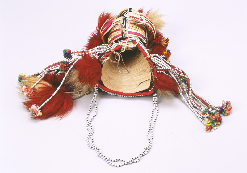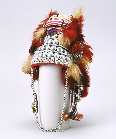 竹、布、種子ビーズ、ボタンなど Bamboo, cotton, seeds, buttons タイ、アカ族 Akha of Thailand 20世紀 20th century CE 本体周24.0 cm, 高15.5 cm D.24.0 cm, H. 15.5 cm 竹を曲げ組み合わせて芯にし、表面に布をかぶせて金属や種子のビーズ、ボタンなどを縫いつけます。更に毛糸の房やモール、種子ビーズを連ねた物をなどで飾っています。 The elaborate headdresses of Akha women vary in details of design and shape, reflecting their status and taste. This colorful example is made of bamboo strips, metallic beads, seeds, and ribbons. They constantly wear these headdresses even during farm work. |