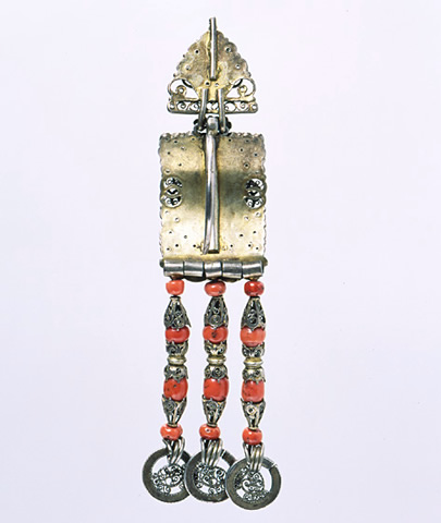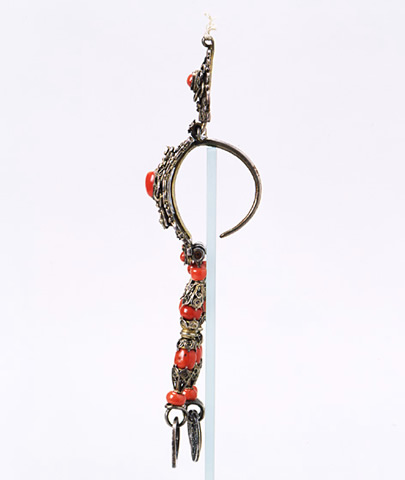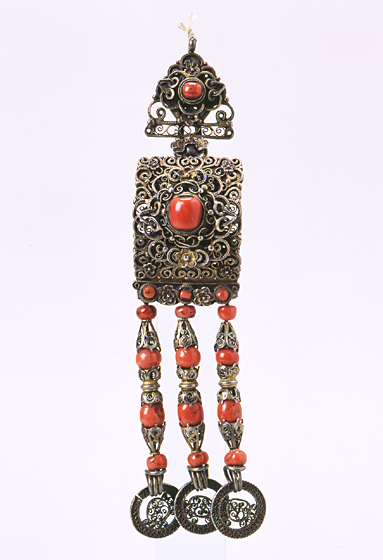 銀 Silver 中国東北部 Northeastern China 清 19世紀~20世紀初頭 Qing dynasty, 19th-early 20th century CE 長20.4 cm, 幅4.5 cm L. 20.4 cm, W. 4.5 cm ディアデマのような鉢巻き状の頭飾りに付ける装飾品です。ちょうどこめかみのあたりに吊り下げます。この資料のように銀線細工に貴石や珊瑚を組み合わせた例が知られています。 An ornament attached in pairs to a diadem-type headband for women. The intricate designs like this example combine silverwork with semi-precious stones and corals. |